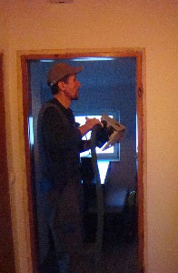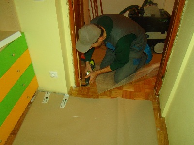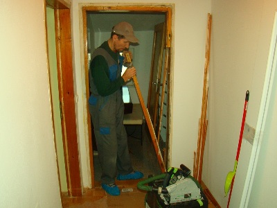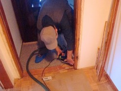 Pričetek demontaže vrat in podbojev.  V podboje zarežemo s krožno žago na katero je pritrjena cev sesalnika, da preprečimo umazanijo in prah.