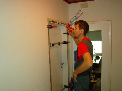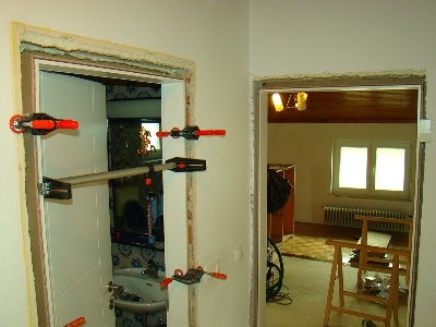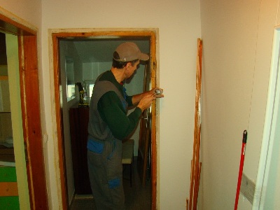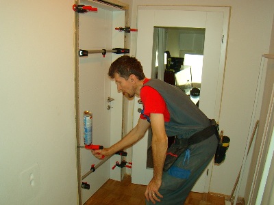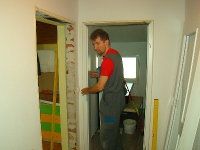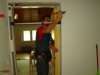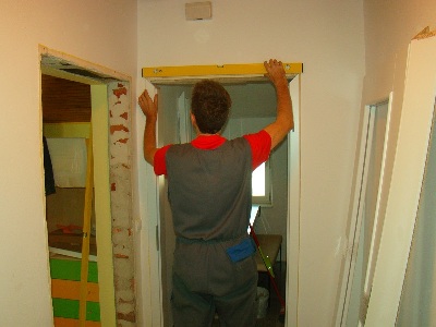 Ko smo odstranili stare podboje, pričnemo z nameščanjem novih podbojev. Pri vstavljanju jih natančno nastavimo z vodno tehtnico, kar nam kasneje ob uporabi omogoča brezhibno odpiranje in zaklepanje vrat.