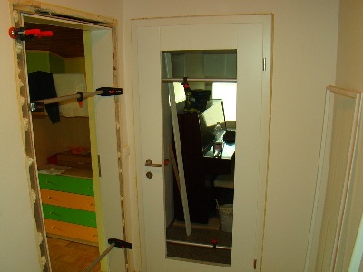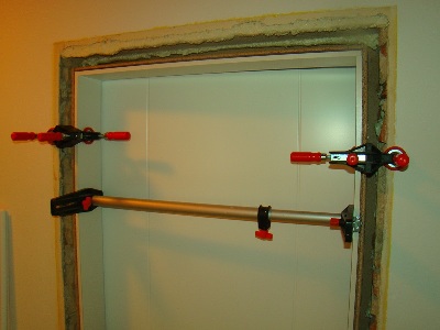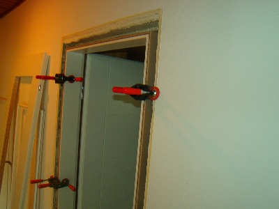 Ko so vrata pravilno nastavljena z vodno tehtnico, jih dobro pritrdimo v ležišče med odprtino in podbojem z napenjalci in mizarskimi sponami, ter zaradi boljše lege krila in podboja nataknemo vratna krila, .
